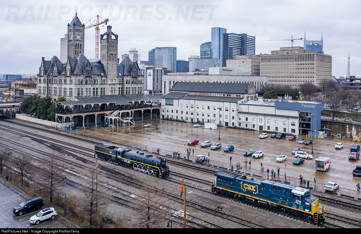 Drone Shot - Nashville's historic Engine #576 took it's first journey in 65 years by rail, NC&STL #576 on display in front of Nashville Union Station along with CSX #576 (NC&STL Sticker on the nose), Thanks to CSX & Nashville Steam for the special event.
