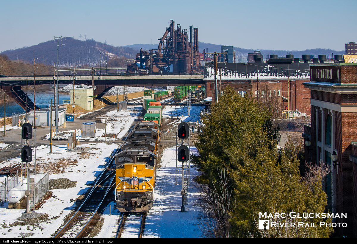 Waiting for the turn. When Norfolk Southern Corp 212 went east the day before, across the region its three Union Pacific Railroad engines were noted by railfans. On Saturday, March 9, 2019, 211 passes through Bethlehem, PA with UP 9072 (SDACe) in the lead and the Steel Stacks formerly Bethlehem Steel in the background. The new signals of CP Bethlehem have been installed, and the former Union Station of the Lehigh Valley and Reading Railroads frames the picture to the right.
