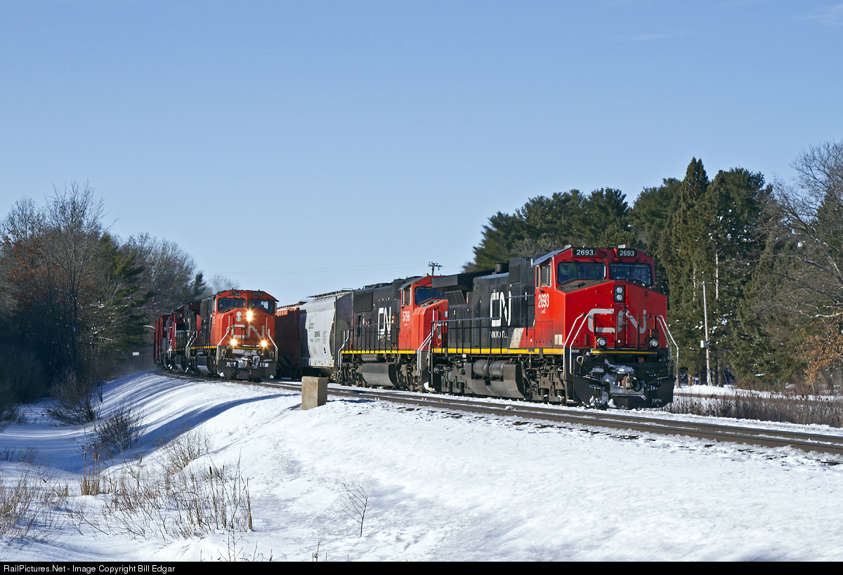 CN 2693 is stopped at a siding at Rocky Run just west of Stevens Point, WI where its train has just received a new crew to take the train east to Fond Du Lac. They will have to wait a bit though as they are overtaken by another eastbound freight led by CN 5763, an SD75I. After this train passes, a westbound will leave Stevens Point and pass CN 2693 before they can finally head east.