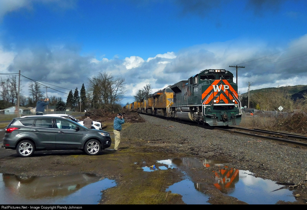 | Rainy skies part and local foamers gather to catch a UP Heritage unit as is glides thru Walker, Or |