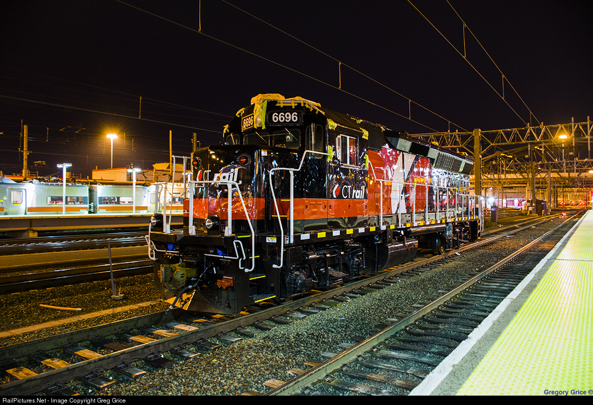 Newly rebuilt CTrail GP40-3H 6696 sits on Track 6 at New Haven Union Station shortly after being dropped off by CSX B747. 6696 is the last CDOT owned locomotive to return from NRE, completing the GP40-3H rebuild contract. |