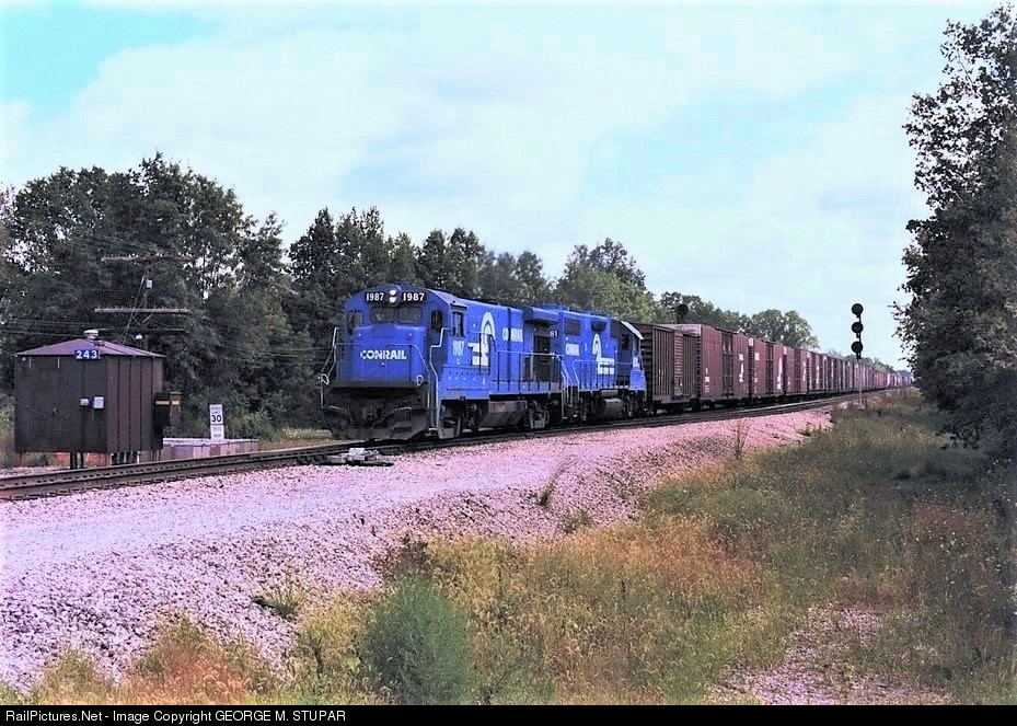 | Conrail B23-7 1987 leads a mixed freight at South Burns Harbor, on the Porter Branch, in 1984. |