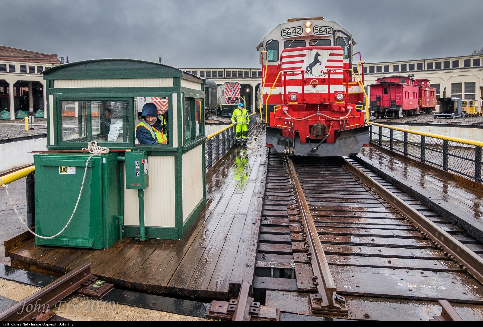 | Dark rain clouds threaten the crew as they spin the Norfolk Southern First Responder's Training locomotive on the turntable at Spencer, NC to get it put away before the next rain deluge. |