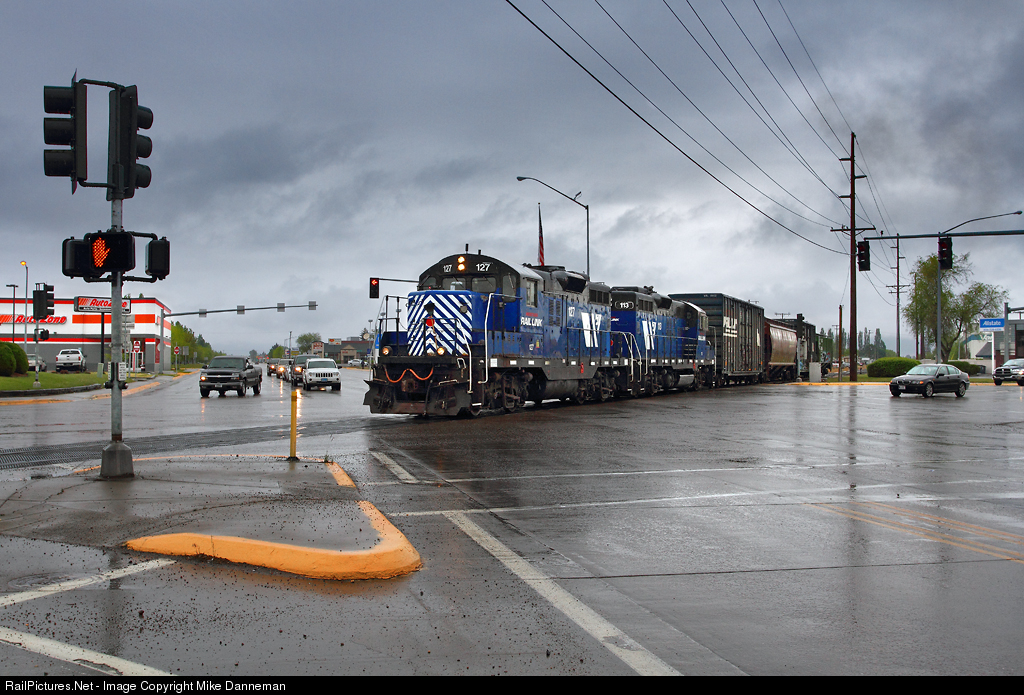 On a rainy spring day, Montana Rail Link’s Bitterroot local crosses the busy intersection of Brooks Street and Reserve Street (which is also U.S. Highways 93 and 12) on the Darby line at Missoula, Montana, on May 18, 2013. Unfortunately, this local, also known as the Darby local, no longer runs—and the venerable Geeps are out of work too with the end of the Paradise local.
