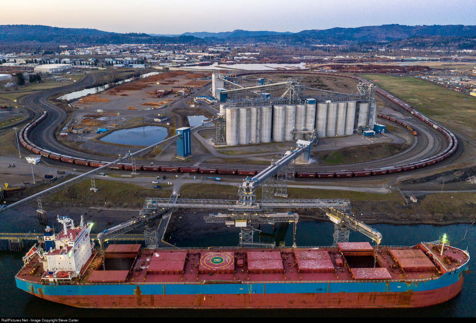 Ever wondered where all those west bound "earth worms" end up? Here's one place. BNSF is off loading a grain train at the EGT facility in Longview Washington, while a ship is being loaded. Soon the ship will be turned around on the Columbia River and sent out to the Pacific to some foreign destination. Even more quickly, the train will be sent to Auburn WA and then over the Stampede pass to some mid-west destination for re-loading.