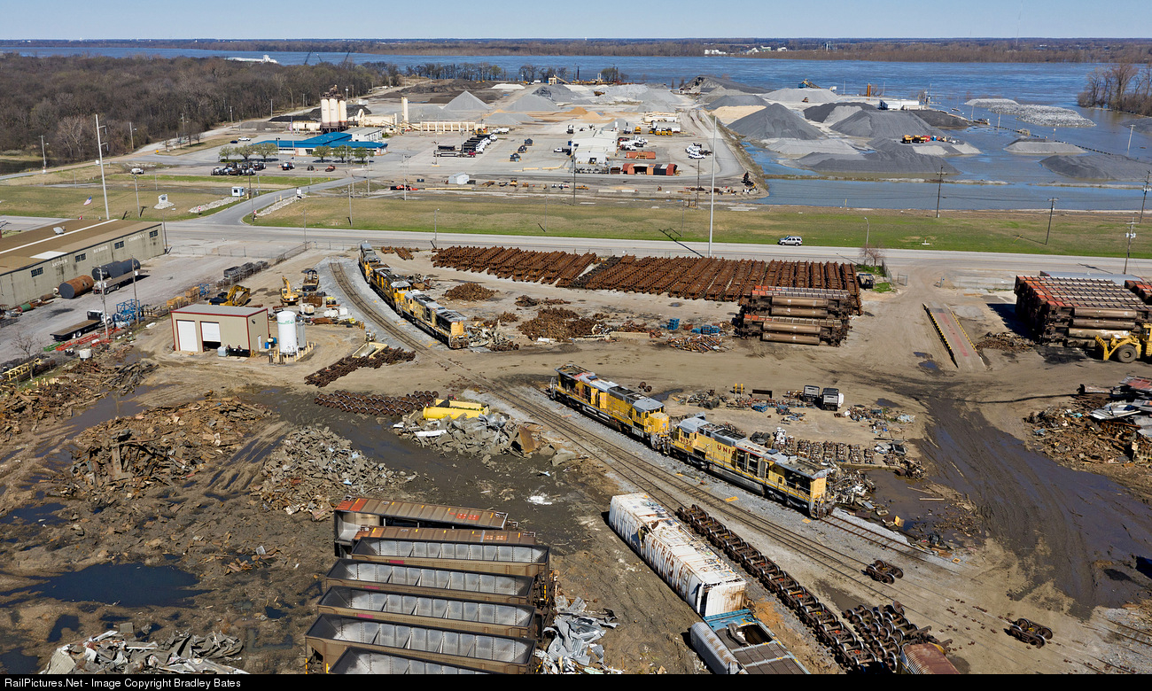 A quartet of Union Pacific C40-8 Locomotives, #9184, #9230, #9295 and #9135, along with UPY S6-1B #940 and many rail cars, are seen below in the process of being scrapped at Progress Rail located on Presidents Island in Memphis, TN.