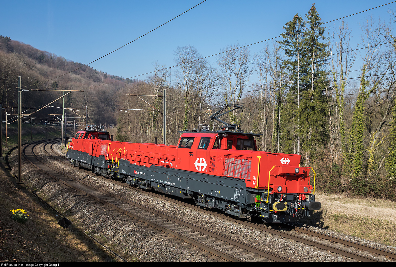 | Dual power eletric/diesel locomotives Aem 940 # 004 and # 002 from Alstom for the SBB on a transfer run from Solothurn to Wettingen, between Turgi and Baden. |