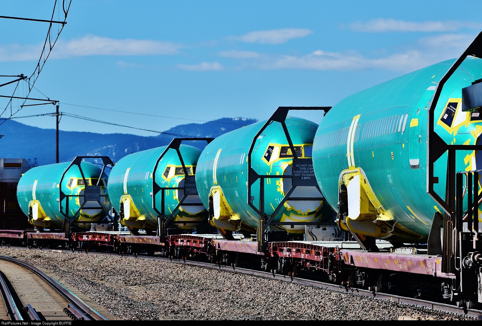 | Four new Boeing 737 fuselages fly via rail in close formation. These new airplanes were built in Wichita, Kansas at Spirit Aerosystems (former Boeing plant) and are being rerouted due to flooding in Nebraska. They will 'fly' through Boulder, Longmont, Fort Collins and divert to Seattle once in Wyoming. |