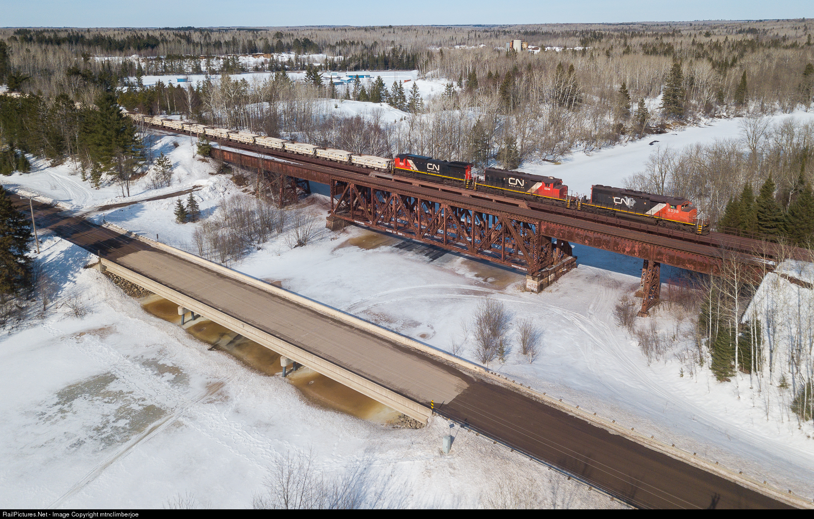 CN 5338 leads another SD40-2W and C40-8 hauling a train of empty Difco side dump cars as they cross the frozen Cloquet River on the way towards Proctor to be loaded with limestone.