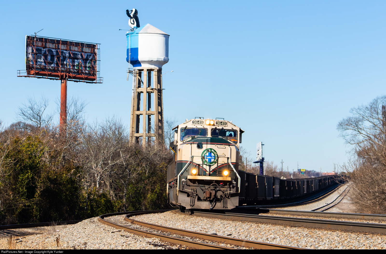BNSF #9649 leads NS #734 out of Atlanta with 135 loads of PRB coal for Georgia Powers Plant Scherer. The water tower in the background has a penguin waving to promote the aquarium to drivers on I-75/85.