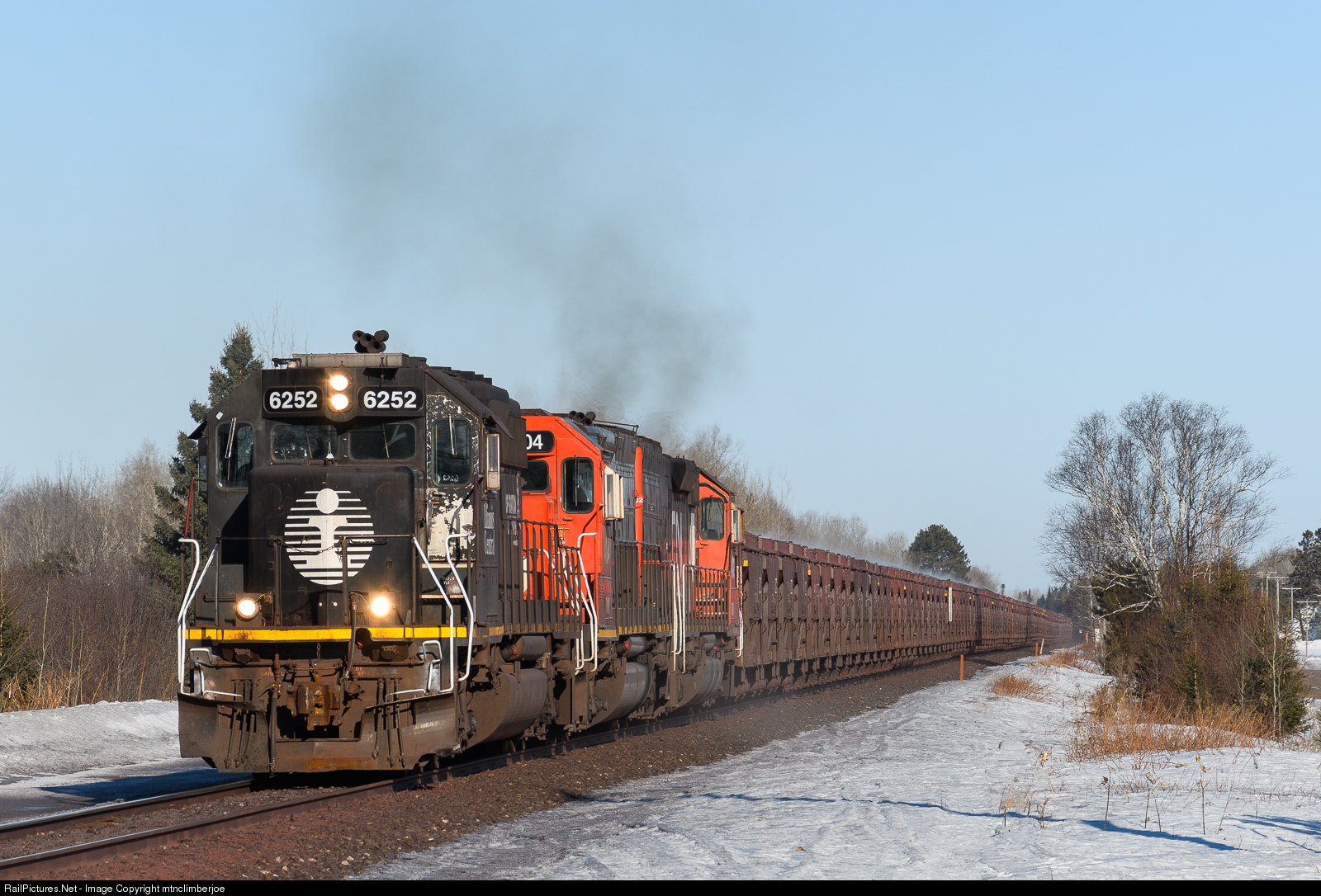 | An Illinois Central Deathstar SD40-3 and two DMIR tunnel motors let out a puff of smoke as they haul a heavy train of taconite pellets towards Duluth. The train is about to clear the N. Coons control point. |