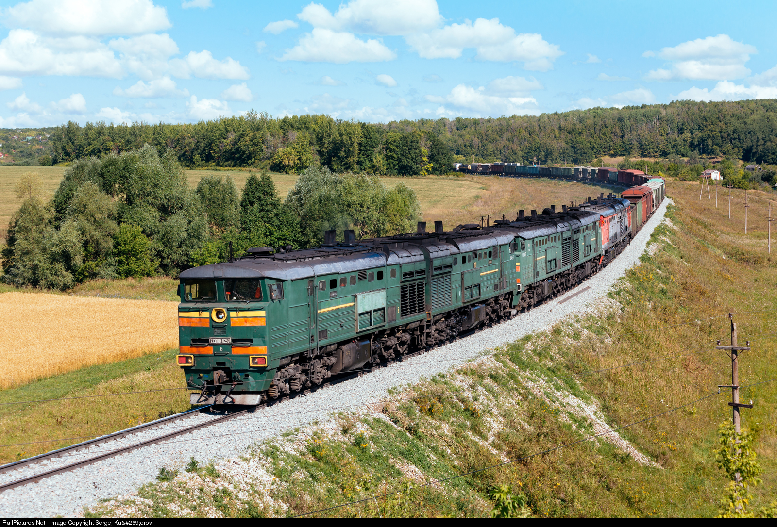 | Triple 2TE10M with heavy freight train to Kanash station. |