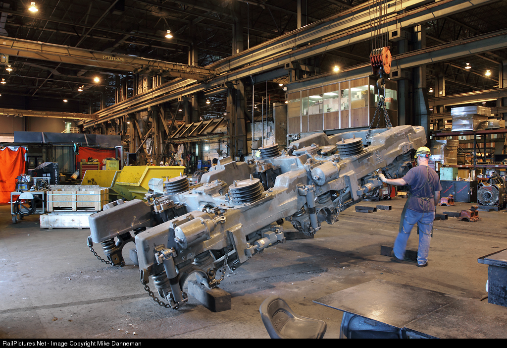 A HTCR-II truck used under an EMD SD70M locomotive is in the process of being rebuilt in the truck shop at Union Pacific’s Downing B. Jenks locomotive shop at North Little Rock, Arkansas, on May 19, 2015. Two machinists have finished up much of the rebuild work on the bottom of the truck while it was upside down on blocks. They are now in the process of using the overhead crane to flip the truck back to a normal position to finish up reassembling parts that are located on the upper portion of the truck. Flipping the truck during the rebuild process makes access much easier.