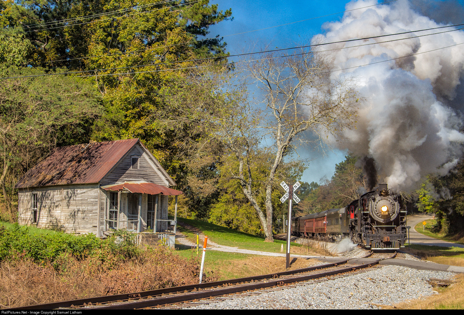 Southern Ks Class Consolidation 630, built by the American Locomotive Company's Richmond Works in February of 1904, leads Southern Ms1 class Mikado 4501 and a long train of passenger cars around the S curve at the famous cabin at Rock Springs, GA. The train is bound for Summerville, GA. The weather was beautiful, albeit cold and windy. A drastic change from the downpour that existed for the entire chase the day before.