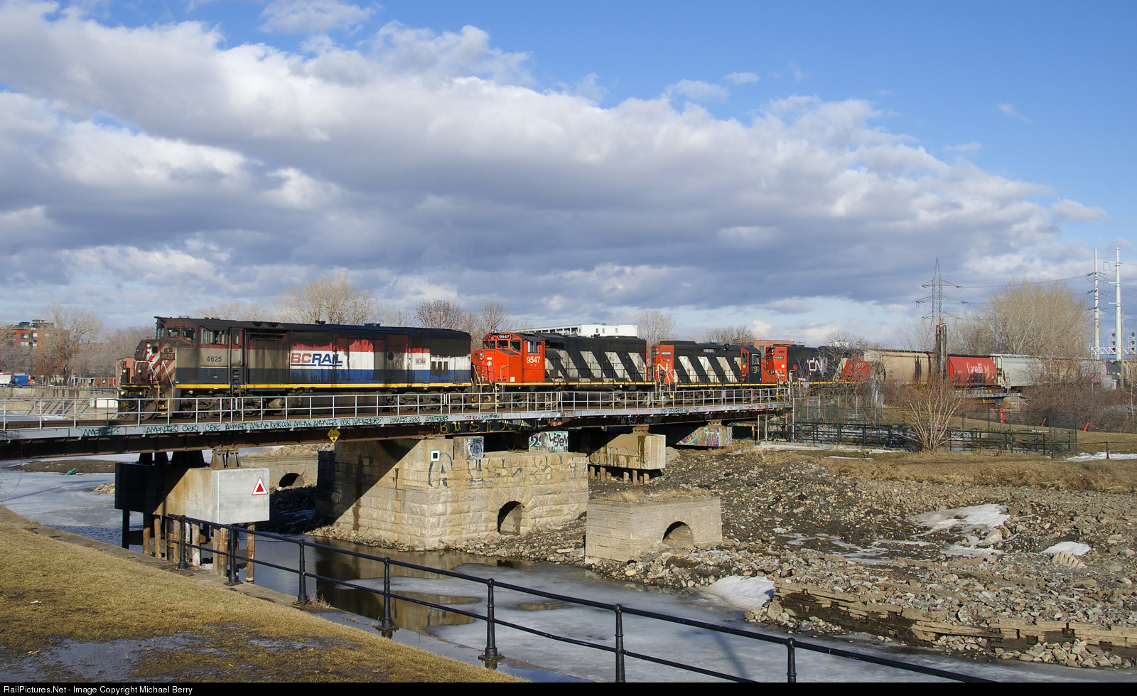 A filthy BC Rail cowl along with three geeps (BCOL 4625, CN 9547, CN 4139 & CN 9677) is the power on CN 527 as it crosses the Lachine Canal. Soon it will back up with the 15 cars it has, as it does a set-off and lift at Pointe St-Charles Yard before heading to Taschereau Yard.