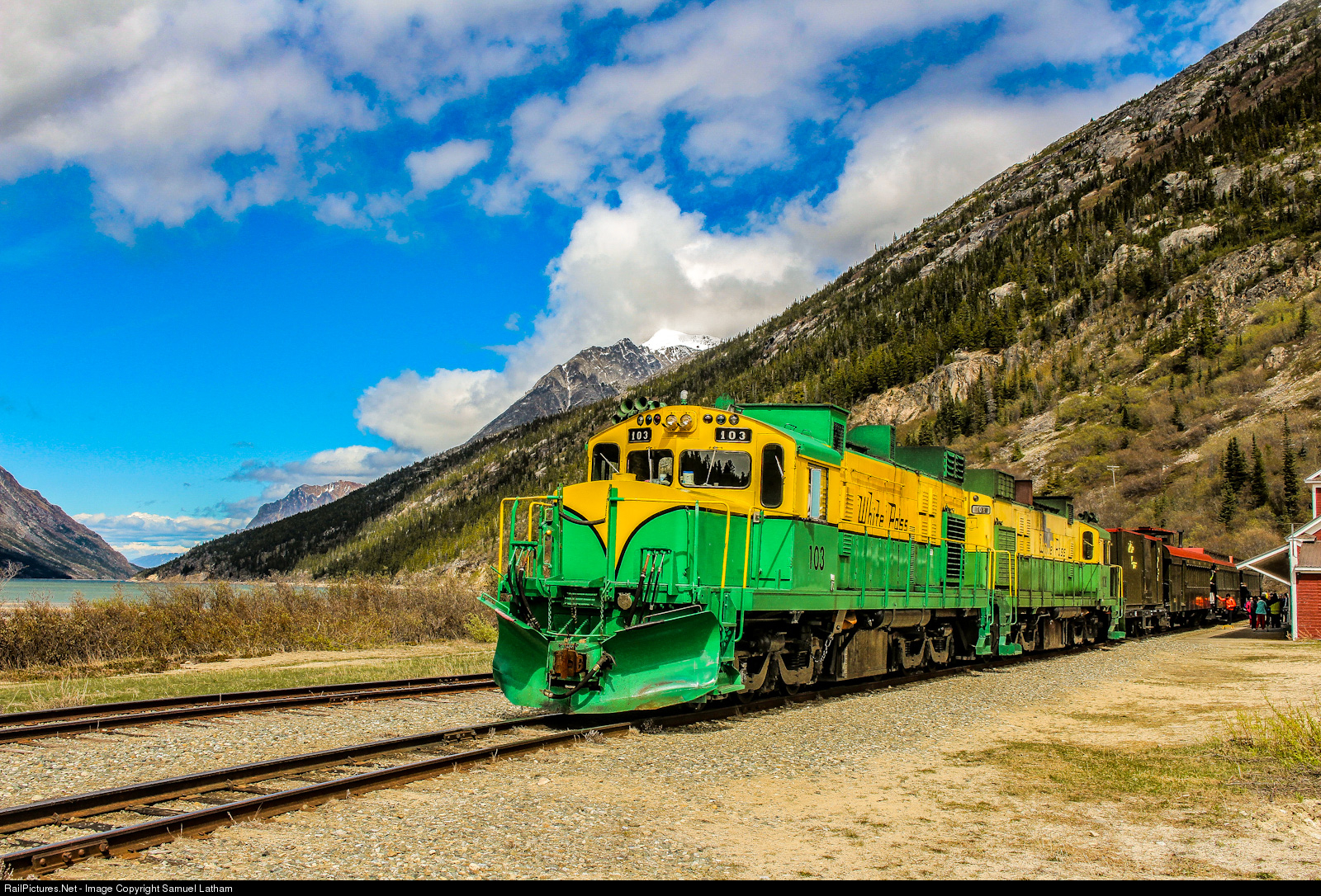 White Pass and Yukon Route MLW DL535E 103 idles peacefully at the Lake Bennett station in secluded British Columbia. The 1969 Montreal Locomotive Works product has just completed the Carcross, Yukon Territory - Lake Bennett, British Columbia leg of the trip for the day, and still has yet to enter the United States and descend the famous White Pass.