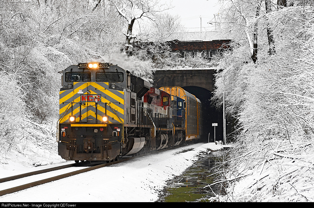 The month of March is going out like a lion in northeast Ohio as three to five inches of snow has fallen overnight covering the area. Pottersburg, OH to North Bergen, NJ rack train Q262 pops out of the series of short tunnels in Cleveland with a grey KCS ACe leading a BCOL and CSX GE.