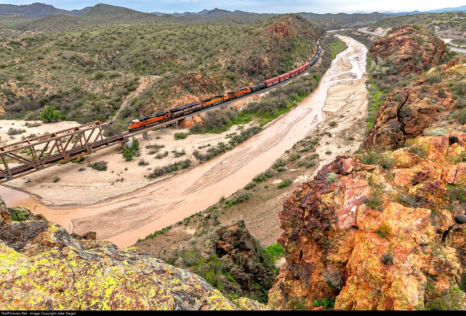 | A train heard by everyone around town, (with 2 EMD’s and a BCOL C40-8M) makes its way through the last scenic section before entering the cityscape. Looking down, the train rumbles through Wickenburg Canyon about to cross the Hassayampa River. |