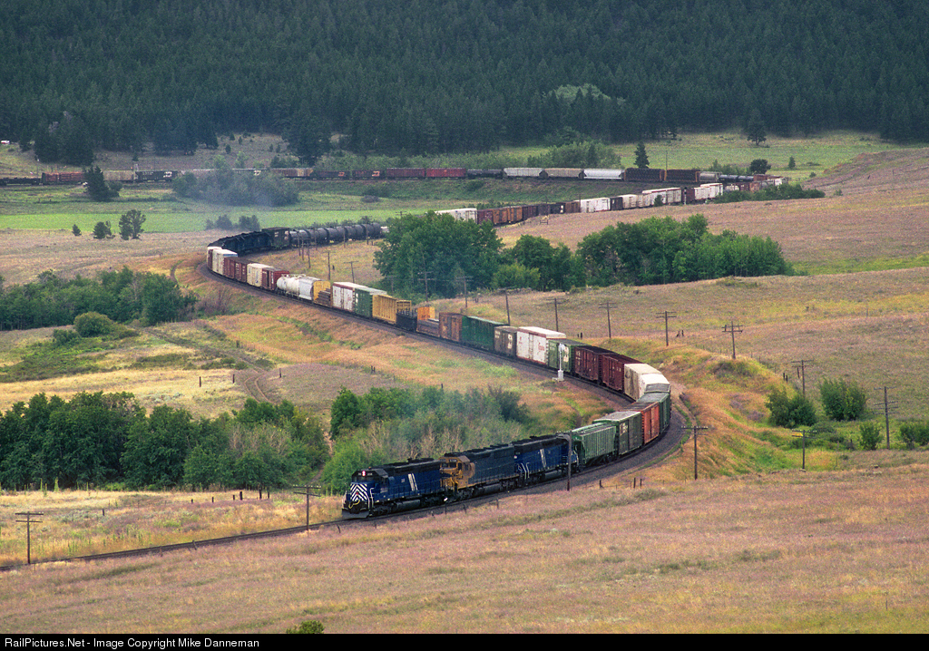 Burlington Northern train 123 climbs the steep grade of Mullan Pass with all-Montana Rail Link power as it works through the curves above Austin, Montana, on August 28, 1993. Up front, MRL SD45 No. 358 leads a pair of SD45-2s, with the middle unit still in patched Santa Fe colors. Half way back in the train in the previous curve is a set of four MRL EMDs of a manned helper set grinding upgrade. Helper sets out of Helena in this era were made up of combinations of SD40/SD45/SD45-2 units.