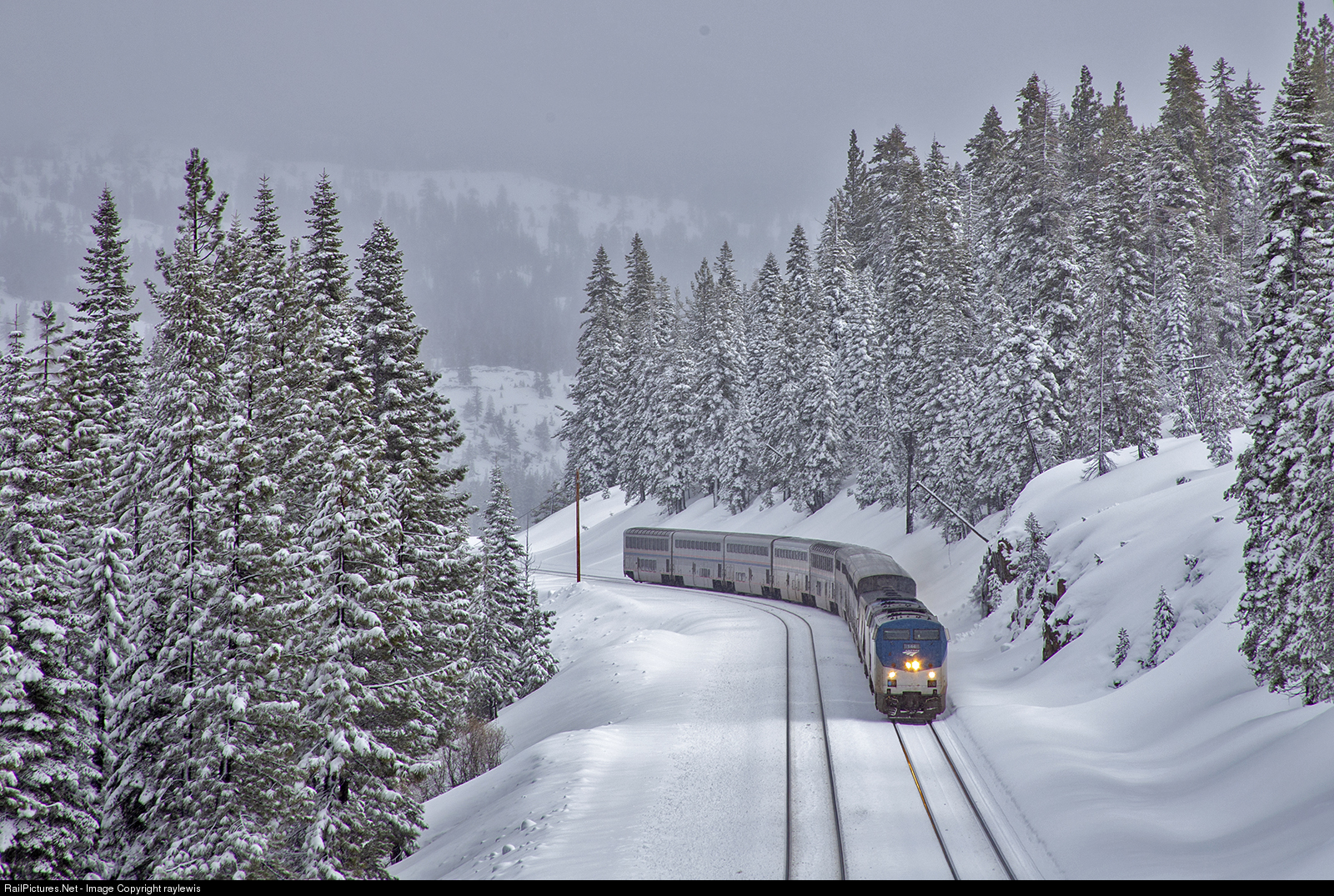 Amtrak #5 travels through the beautiful snow covered Sierra Nevadas.
