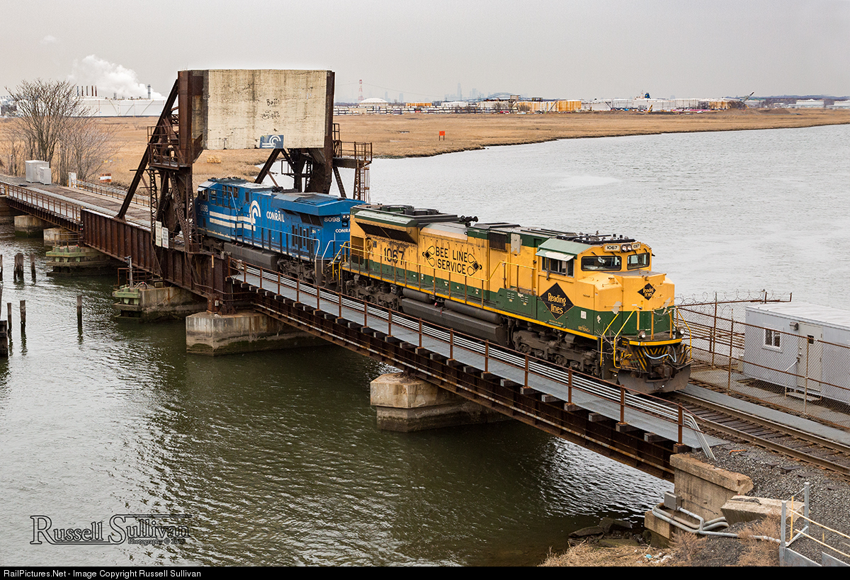 H03 retreats back to E-Rail after laying over in Stiles Street Yard for the night with the Conrail and Reading heritage units. The two went around the wye at Port Reading before heading back northbound on the Garden State Secondary. Pictured are the two crossing the Rahway River at CP Karen in Carteret, NJ. Both of these units are right at home, with the Conrail directly under the can-opener painted counterweight and the former Reading right of way two miles south of here.