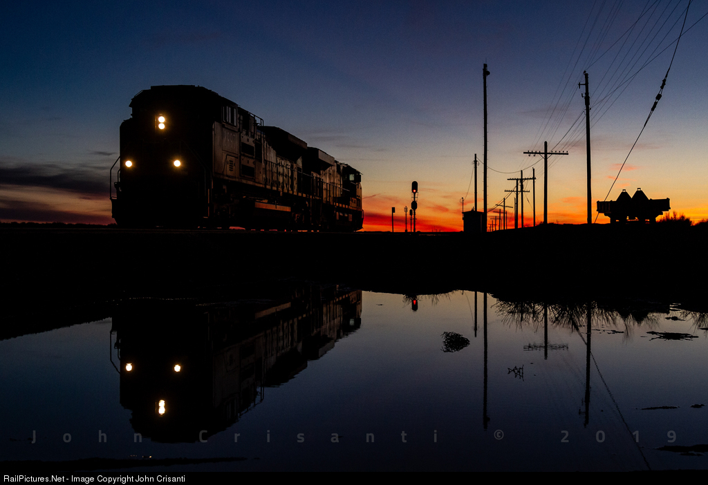 | It's just after sunset as Union Pacific SD70AH No. 8997 comes to a stop at the east siding switch in Cisco, Utah, on March 15, 2019. The light power will get flagged into the siding and pick-up the tied down Potash Local and take it back to Grand Junction. A lot of Rio Grande signals and mileposts still stand west of Grand Junction reminding who owned these rails. |