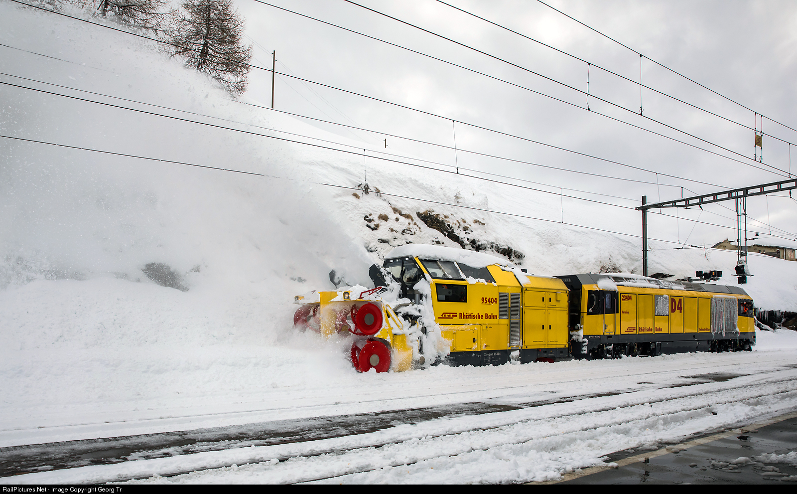 | A late onset of winter brought more then 3 feet (about 1 meter) new snow in the Bernina region the day before. The snow fighting crew from Poschiavo is clearing track 3 of Alp Grüm station with Xrot mt # 95404 and dïesellocomotive Gmf 234 # 04. |