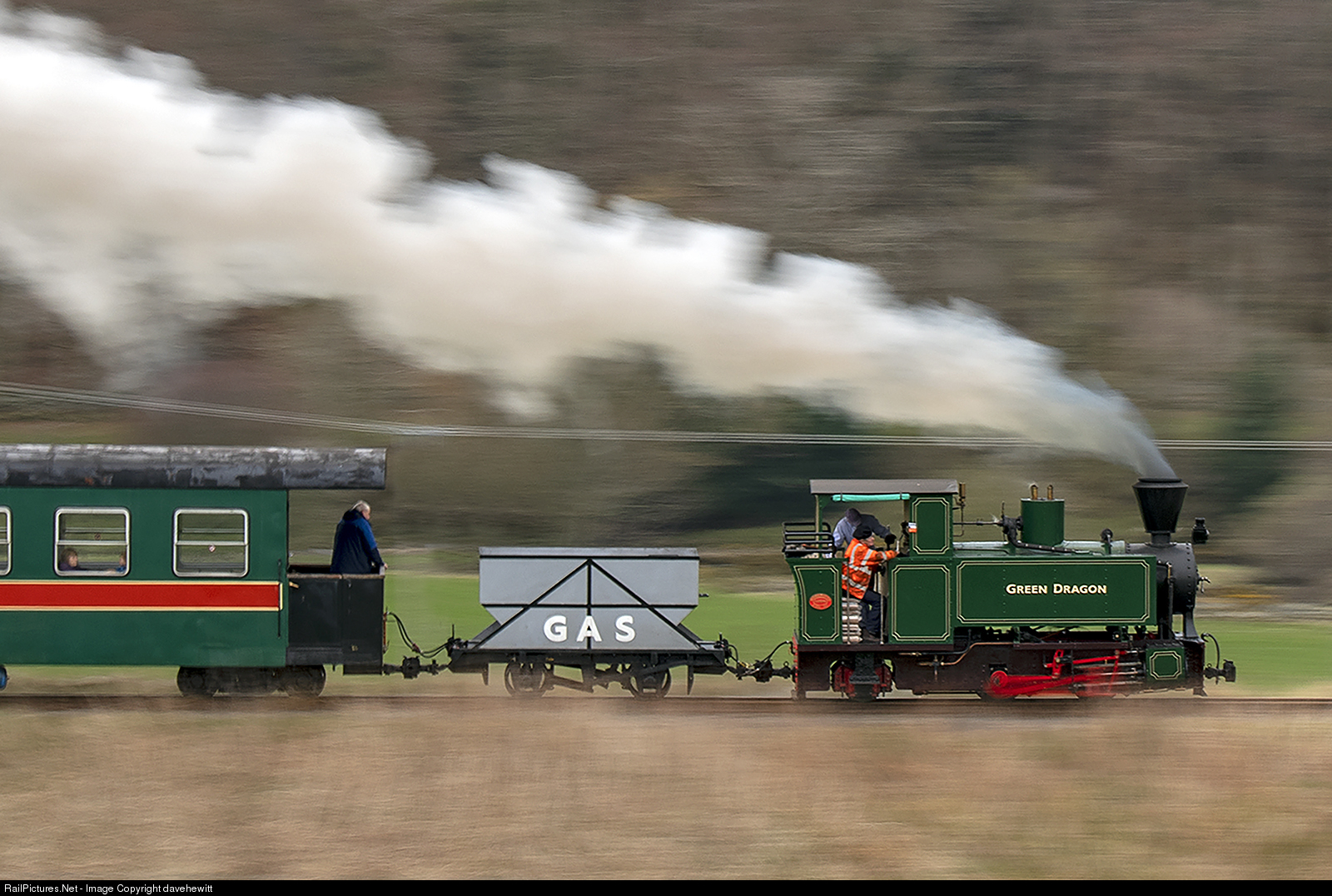 Green Dragon is an eco-friendly steam locomotive as it burns wooden briquettes,lots of them.(Driver is sitting on some of them. )Used by South Tynedale railway it had a trip out today but had the help of a battery locomotive after its first trip. Does get a decent head of steam and travels quite quickly