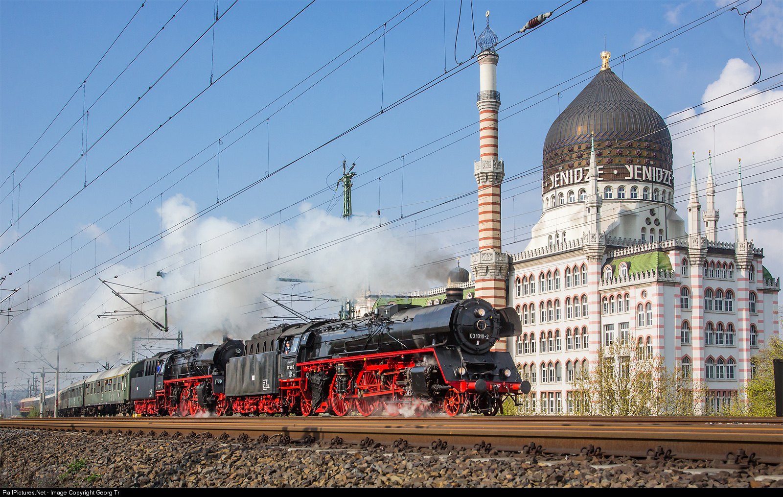 Three cylinder 4-6-2 Pacific express train locomotive 03 # 1010 (former Deutsche Reichsbahn, now DB Museum, based in Halle P) and 2-6-2 passenger train locomotive 23 # 1097 (former Deutsche Reichsbahn, now "IG 58 3047 Glauchau") are pulling a train from Dresden to Riesa in front of the Yenidze tabak factory. 03 # 1010 was built by Borsig in Hennigsdorf/Berlin in 1940 for the Deutsche Reichsbahn and can reach 140 km/h. 23 # 1097 (from 1970: 35 # 1097) was built in 1959 by Lokomotivbau Karl Marx (LKM) in Babelsberg for the Deutsche Reichsbahn of the German Democratic Republic (GDR) and can reach 110 km/h. The Yenidze was built in 1909 by architect Martin Hammitzsch as a cigarette factory for industrialist Hugo Zietz in form of a oriental mosque. The name comes from the tabak growing area in the north of today Greece.