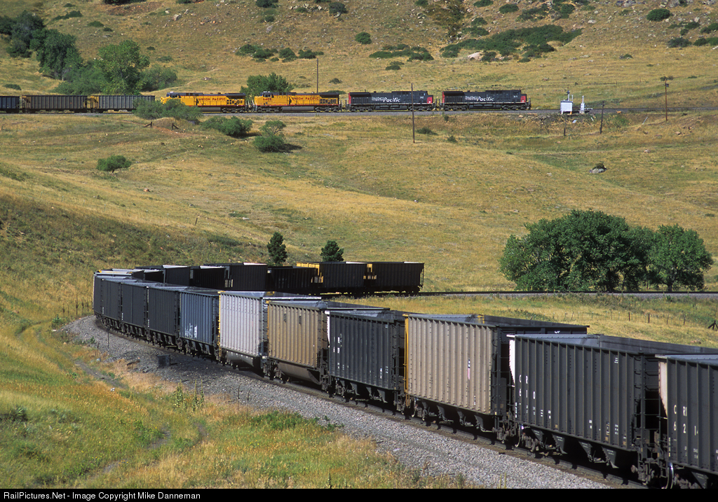 In a view inside Colorado’s Big 10 Curve, a westbound Union Pacific coal empty at Clay passes above the rear of the train heading toward the big curve west of Rocky on the morning of August 4, 2001. Four GE AC4400CWs power the train, led by Southern Pacific Nos. 314 and 182.