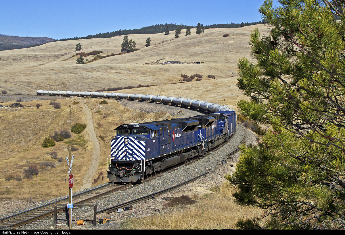 | MRL 4406 and 4408 descend Evaro Hill on the outskirts of Missoula, MT with the morning gas train after making a turn from Missoula to East Thompson Falls. Most trains west of Missoula utilize BNSF power on the Montana Rail Link, so this train is always a treat to find. |