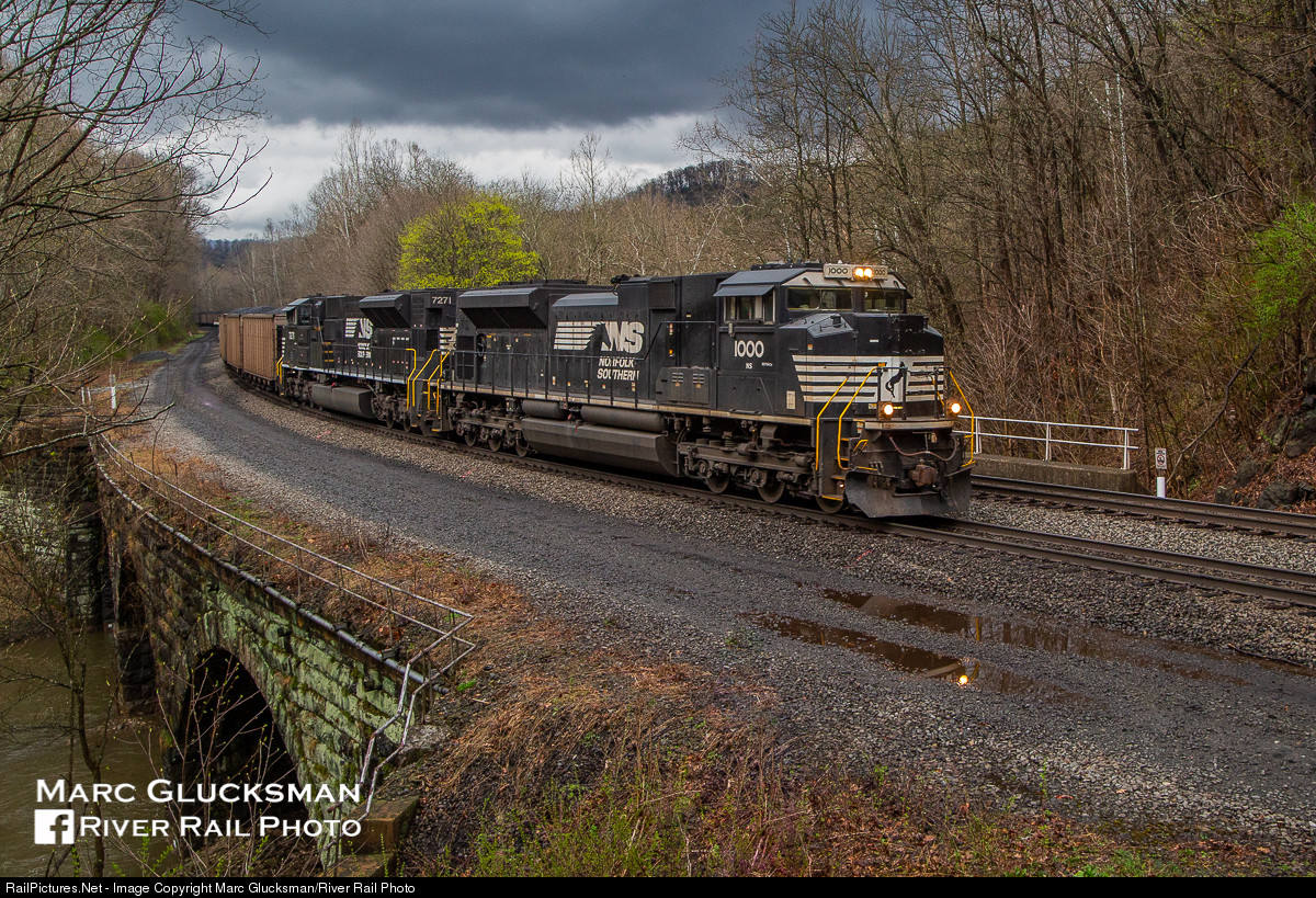 The class unit. The modern workhorse of EMD’s offerings is the SD70ACe, a product that has returned it to more widespread industry acceptance. Norfolk Southern Corp 1000 is in fact #1 of NS’s order, and was built in February, 2011. Under heavy storm clouds, it rolls past MP 219 in Birmingham, PA over the Little Juniata River with loaded coal on Train 746 on the evening of Sunday, April 14, 2019.