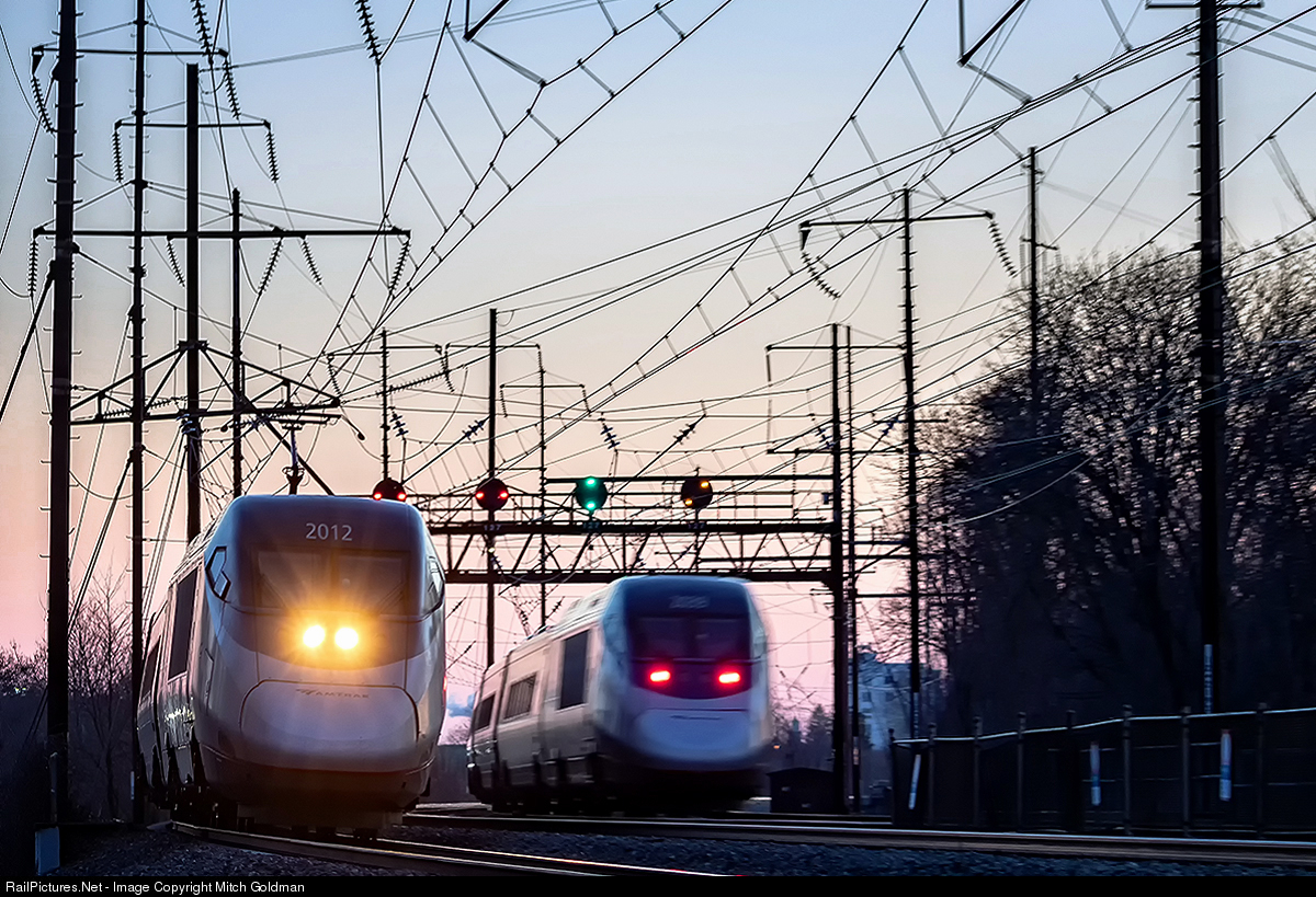 | Two Amtrak Acela Express's captured in a first ever "zoom-pass" pan shot at Eddystone, Pennsylvania. No. 2012 is leading the northbound to Philadelphia while No. 2039 pushes on the rear of the southbound train destined for Wilmington, DE by sunset. Though I had hoped for a bit more blur at 1/25th, I still thought it was a pretty "sharp" shot worth a share! |