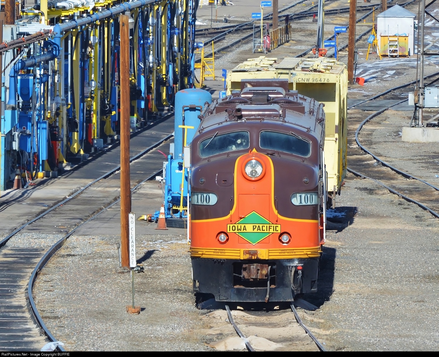 SLRG 100 (Iowa Pacific Holdings E9A) spent the night in the Union Pacific's North Yard on its way to join the San Luis & Rio Grande Railroad in Walsenburg, Colorado. This engine has had quite the career, having started life in 1949 as an E8A with the Chicago Burlington & Quincy Railroad, then worked with the Burlington Northern, where it was converted to an E9A, then to the Illinois Central Railroad.