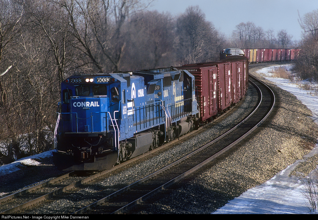 At 12:12 p.m. on January 13, 1990, Conrail ELPR3 (Elkhart to Proviso) freight swings through the curves at New Carlisle, Indiana, powered by C40-8 No. 6033 and EMD SD40 No. 6359. No. 6033 was only ten months old, being built at Erie in March 1989. I spent quite a bit of time there on that hill at the edge of the cemetery capturing non-stop Conrail action…