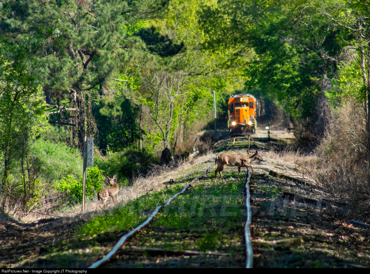 | Deer! Its spring in the south as a pair of deer wander across the rickety tracks of the Mississippi Central. In the background MSCI 488 slowly approaches with a cut of cars from storage going south to Holly Springs and BNSF. The deer had plenty of time to move as the train trundled forward. The deer watching me even had time to graze in the track gauge for a little bit. |
