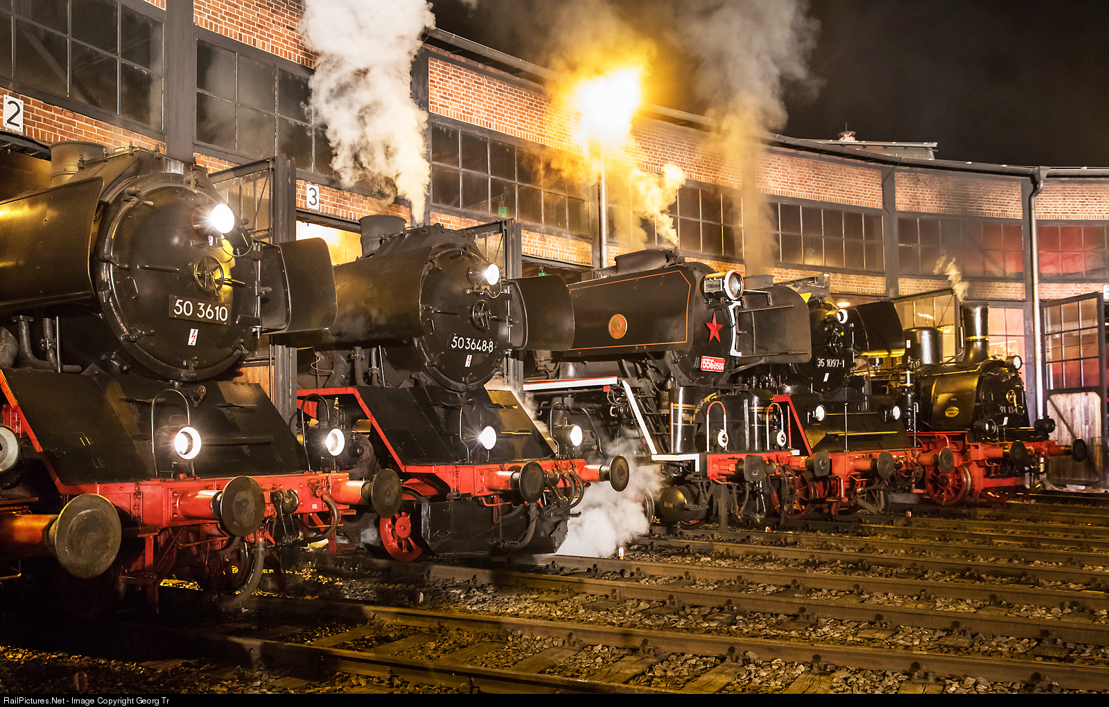 5 steamlocomotives under pressure during the photo night at the shed of Bw Dresden Altstadt, from left 2-10-0 50 # 3610 of of WFL-Wedler & Franz GbR from 1941. 2-10-0 50 # 3648 of Sächsisches Eisenbahnmuseum Chemnitz (SEM) from 1941. 2-10-0 556 # 0506 of the Czech State Railway from 1958. 2-6-2 35 # 1097 of the Interessengemeinschaft Traditionslok 58 3047 e.V. at Glauchau from 1959. 2-6-0 91 # 134 of Leipziger Dampf-KulTour from 1898.