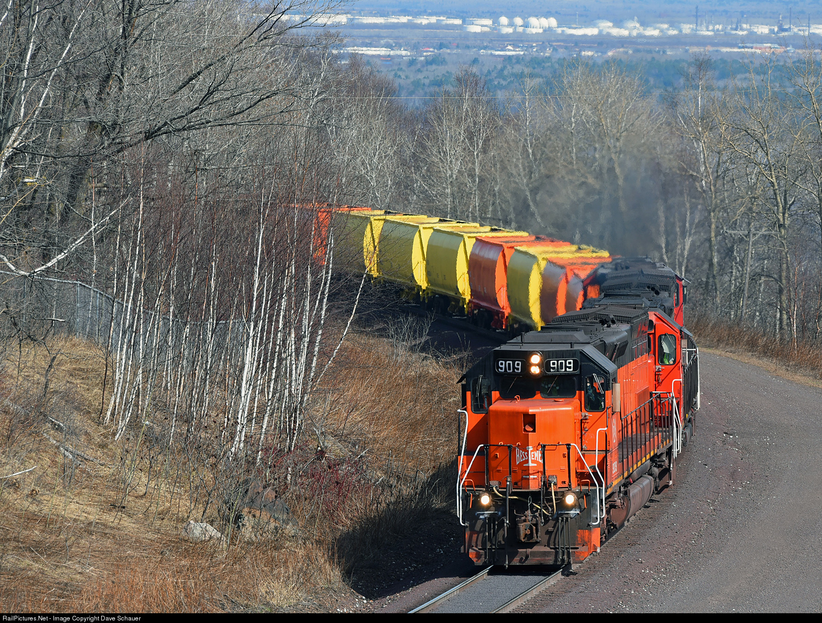 | Bessemer & Lake Erie 909 leads DM&IR 405 and B&LE 900 up Proctor Hill with empty blast furnace trim cars (crushed raw taconite rock). The bright cars can also double as ballast haulers. |