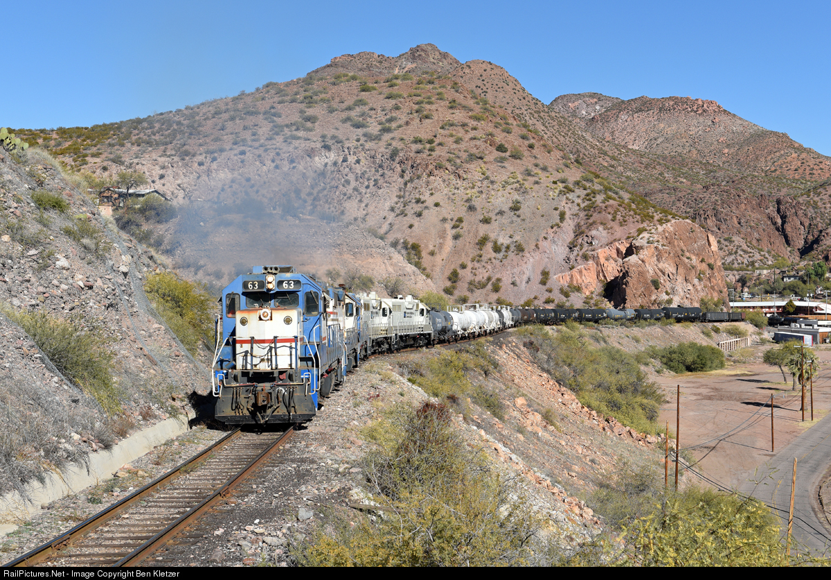 Freeport McMoran #63 slogs up the steep 5% grade up Shannon Hill with a long train of empties for Morenci. This steep, winding section of track was originally a three foot gauge branchline to Shannon Smelter, later the Shannon-Arizona Railway. The curves and grade are as built but the track gauge and power are much changed from the tiny 3 foot gauge 2-8-0s that once climbed these same hills.