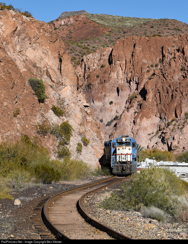 Freeport McMoran #63 peeks around the red rock cliffs at the bottom of the 5% grade out of Clifton. This steep, winding section of track was originally a three foot gauge branchline to Shannon Smelter, later the Shannon-Arizona Railway. The curves and grade are as built but the track gauge and power are much changed from the tiny 3 foot gauge 2-8-0s that once climbed these same hills.