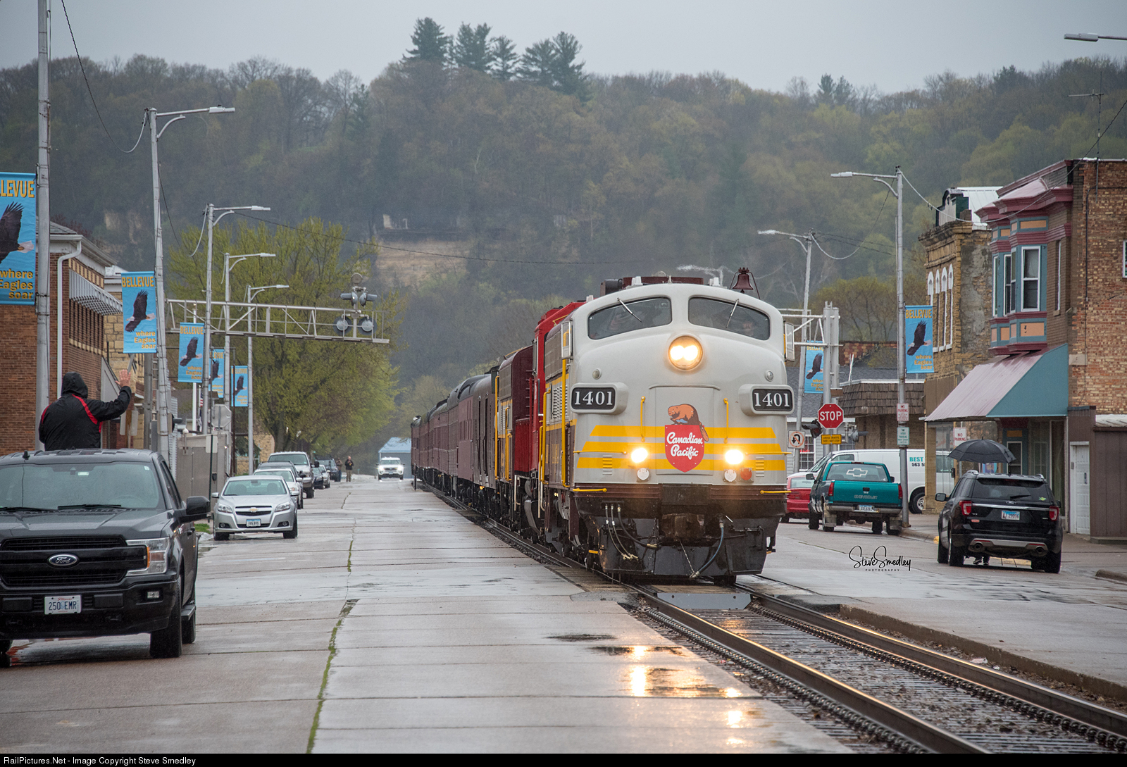 Canadian Pacific Railway's business train rolls through the street running North-bound at Bellevue, Iowa as the Chief Godfather of the Quad Cities salutes the train. Photo Tuesday, April 30, 2019.