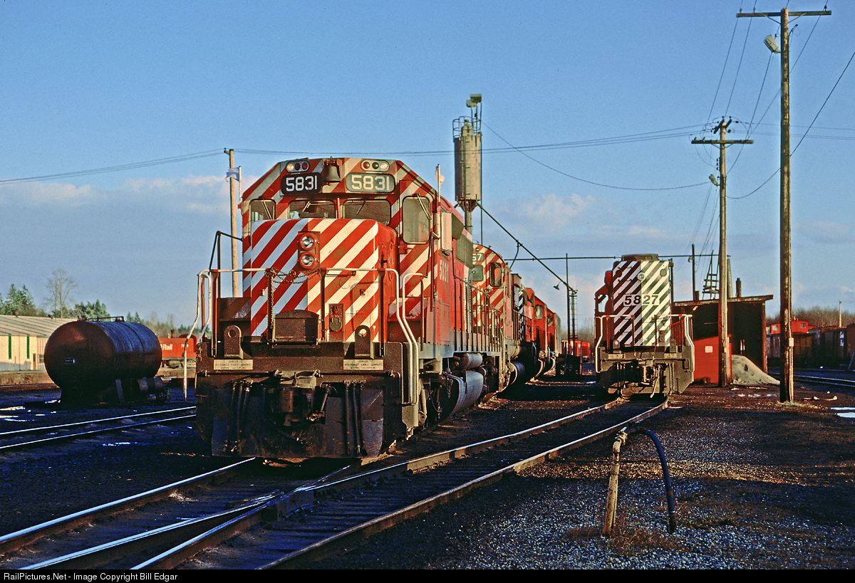 | CP 5831 and a mix of GMD and MLW power are lined up for servicing at Coquitlam Yard, east of Vancouver, BC before taking their next assignments. At this time the "candy cane" version of CP Rails action red was dominant. Note a Baldwin switcher in the background to the left. |