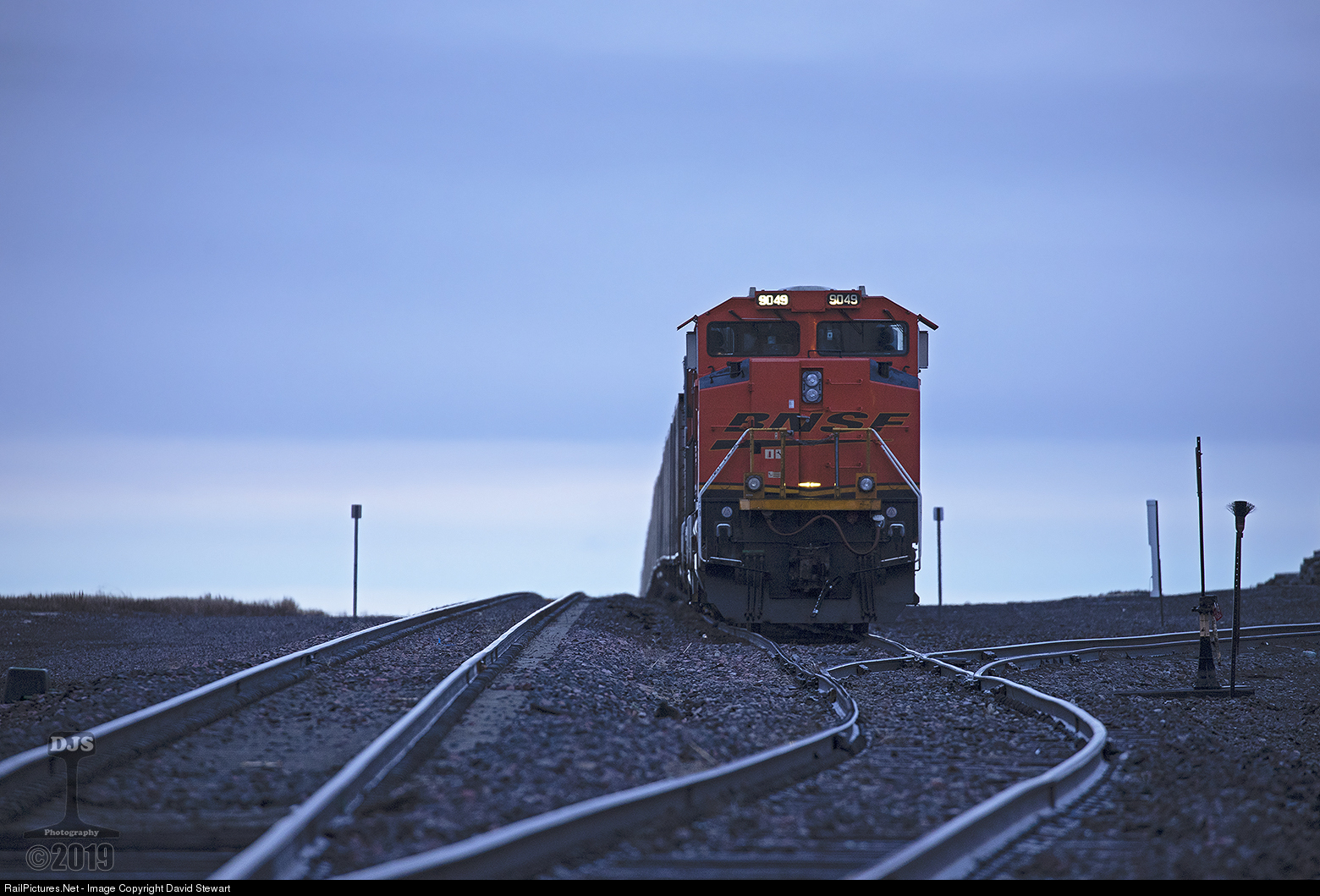 | BNSF SD70ACe 9049 stands at the head of an empty coal train in the siding at Des Moines, New Mexico on May 2, 2019. |