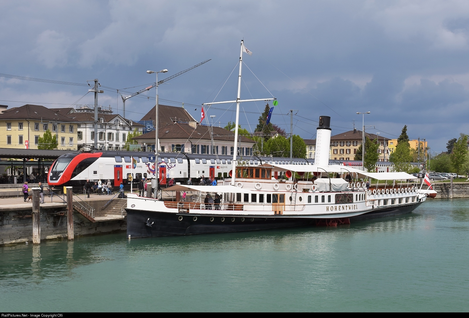 | During the 150 year festivities of the lake shore line (Seelinie) at lake Constance one of the new Twindexx Suisse trains passes the historic steam boat Hohentwiel. Just one glance of the sun spends a little highlight to the picture. |