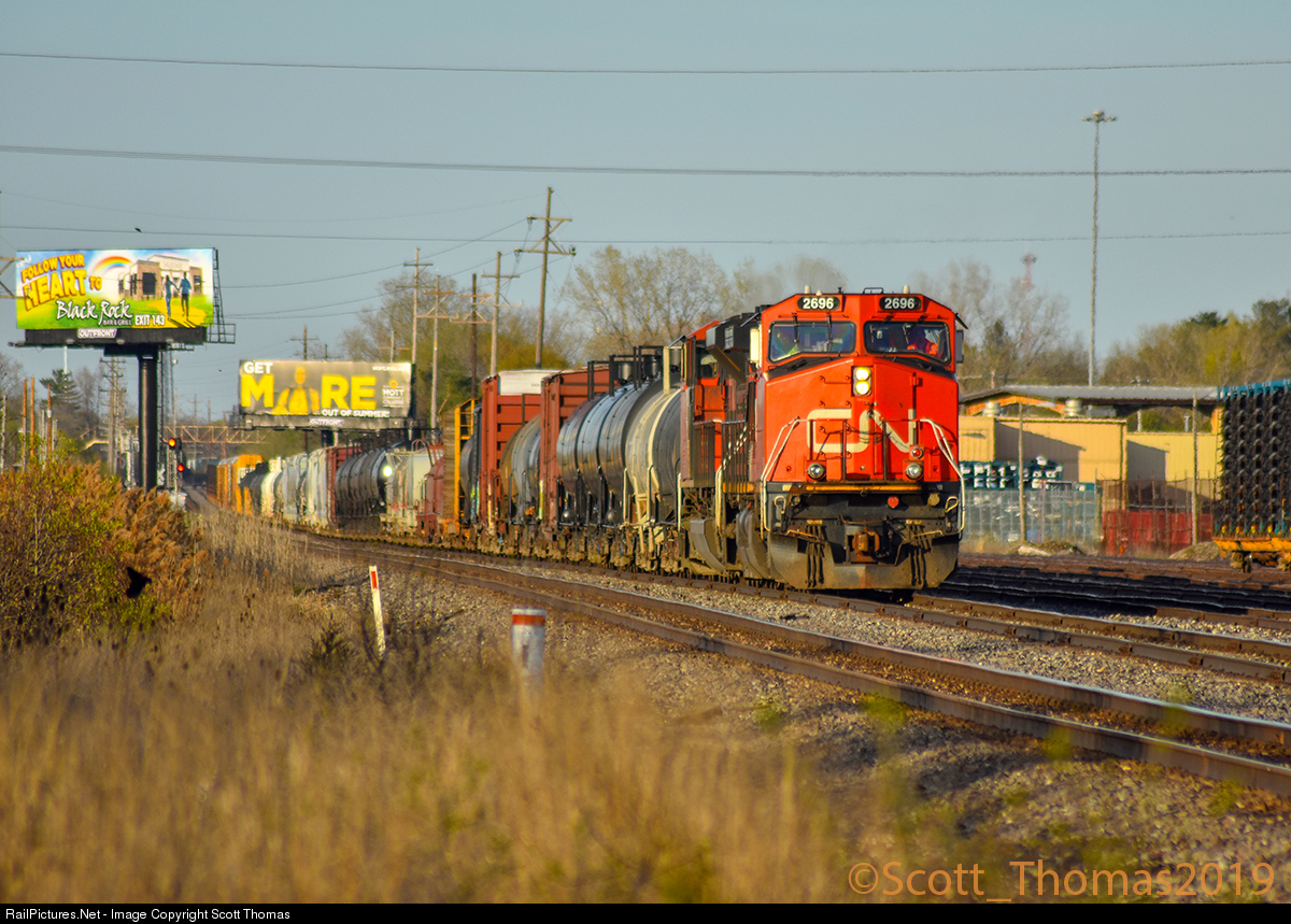 | A late Saturday afternoon has CN Dash 9-44CW and trailing SD70M-2 #8939, lead a consist creeping towards the Bristol Yard, passing the GM Truck plant on Van Slyke Road. They will be dropping off loads of truck frames for GM in a short time. |