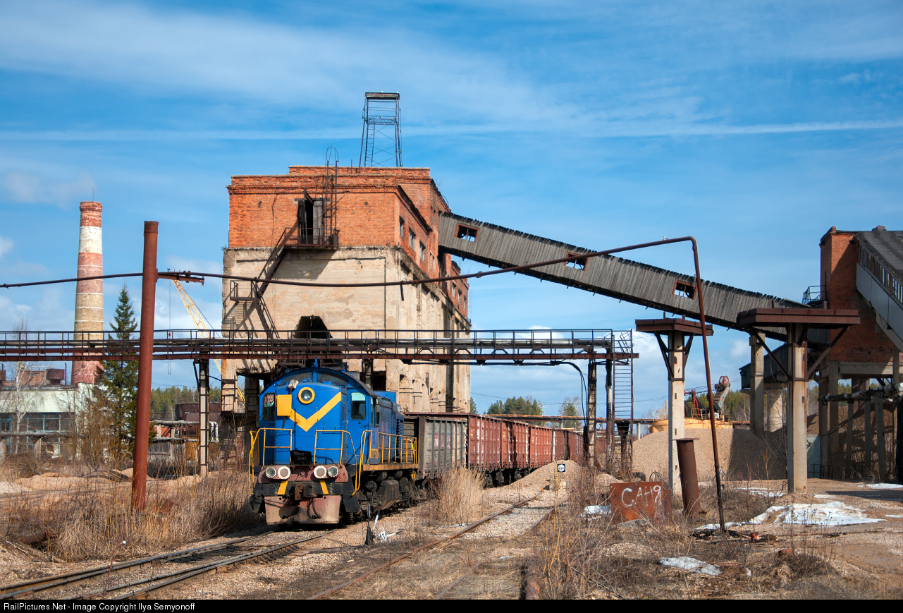 TEM2 locomotive transports empty cars for loading sand on "Vyazma Quarry railroad". "Vyazma Quarry" is one of the largest and most reliable suppliers of non-metallic building materials in the European part of the Russian Federation. The main products of the enterprise are non-metallic building materials: crushed stone gravel and sand for construction work. On the background you can see the main building for material processing.