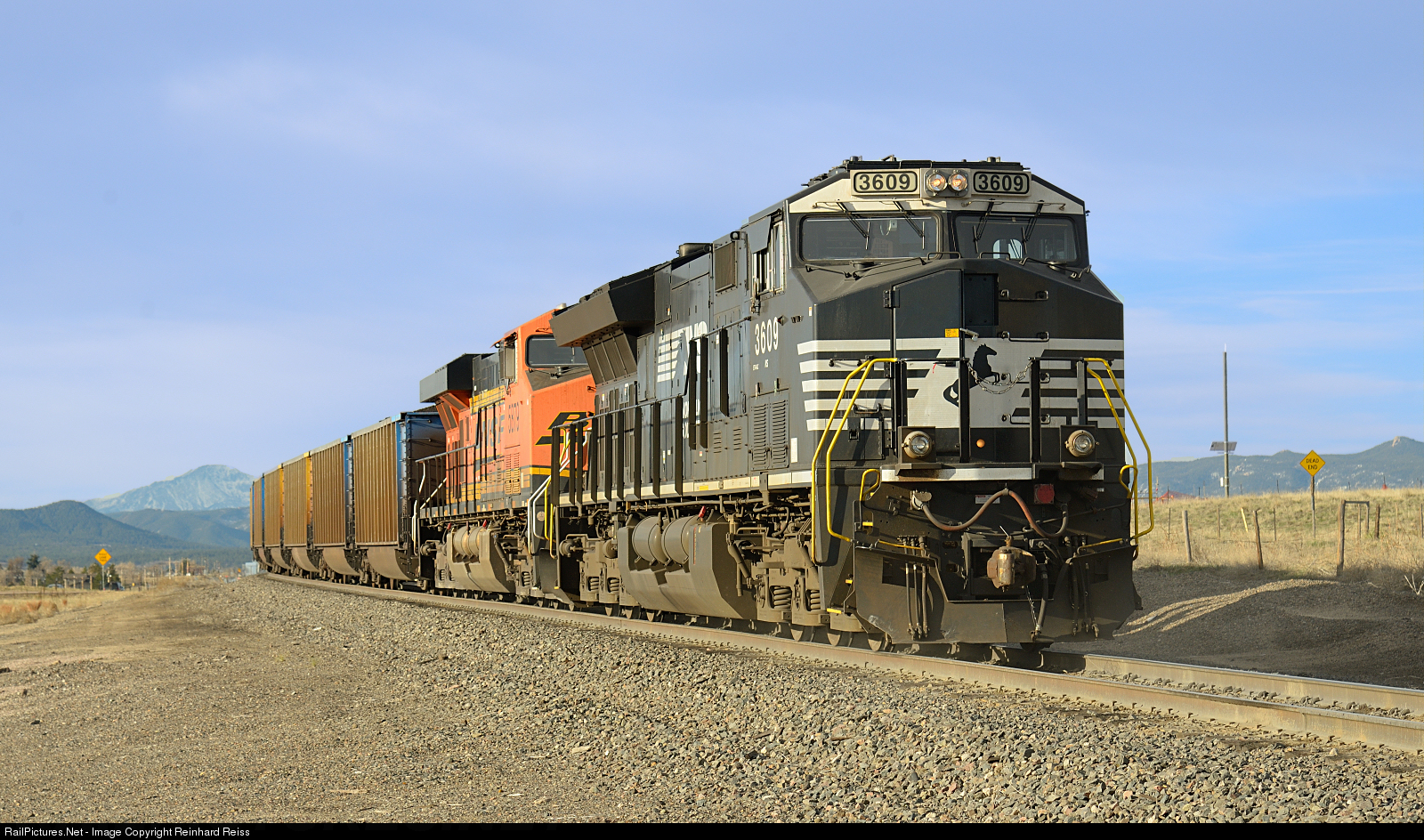 | BNSF 5879 (ES44AC) & NS 3609 (ET44AC) help a southbound coal train on the steady grades from Denver up to Larkspur on the BNSF Joint Line. In the background the Pikes Peak towers above the surrounding mountains. |