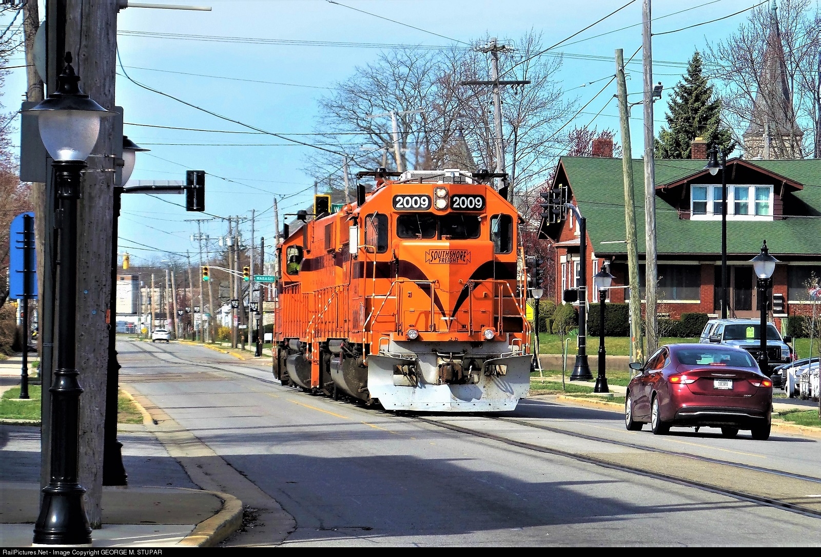 South Shore freight motors cruise through the green lights on 11th street in Michigan City.