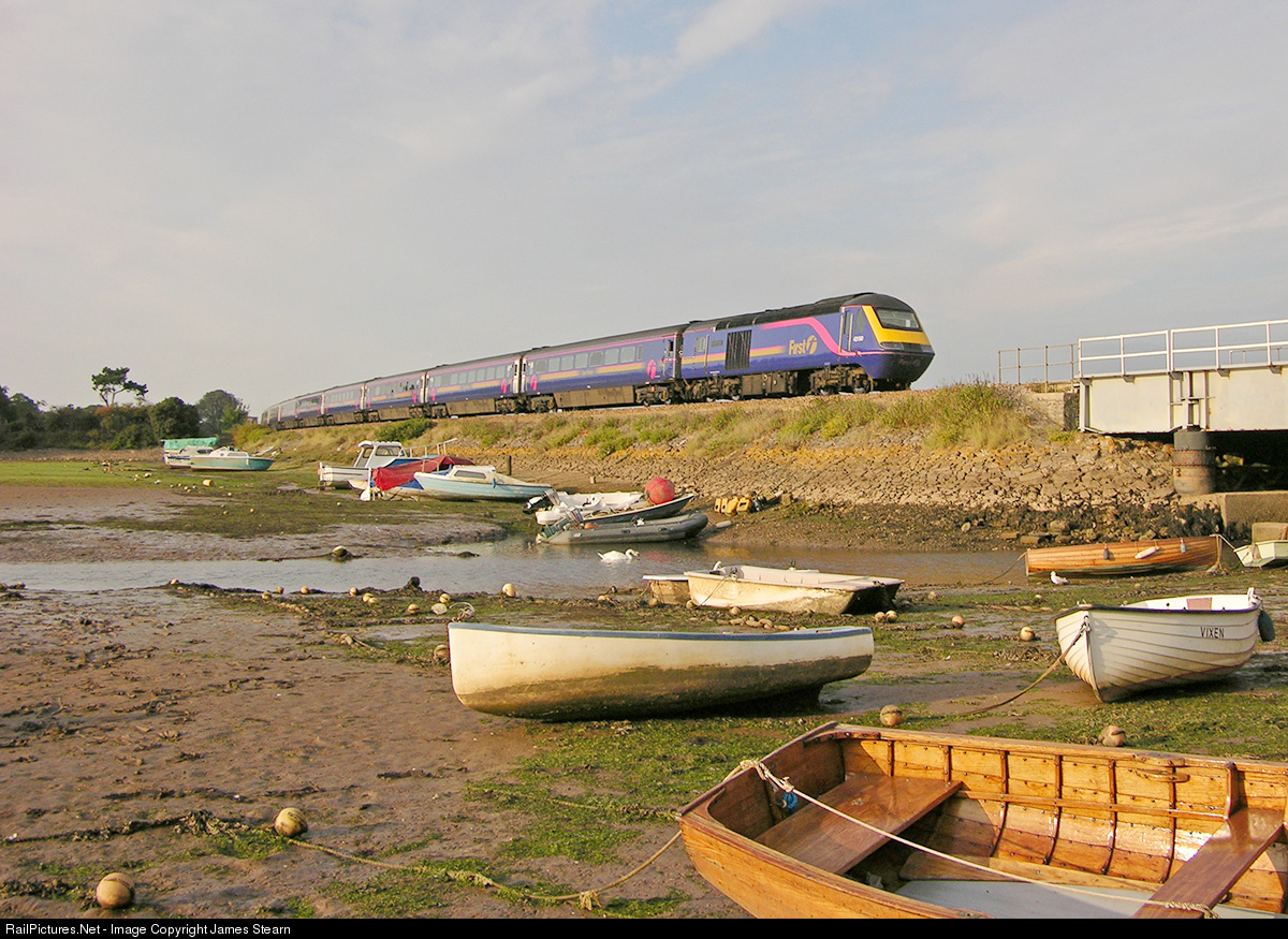 | 43150 is seen with a First Great Western HST running over Cockwood Harbour in Devon. The power car carries the original Paxman Valenta engine, all of which were replaced on FGW between 2005 and 2008 with MTU V16 4000 engines as part of a life extension program. The HST's themselves are now in the final stages of being replaced by Hitachi Super Express units on long distance services between London Paddington, South Wales and the West Country with the last long distance sets scheduled to run on May 18th 2019. A number of shortened sets will be retained for local work in the South West.