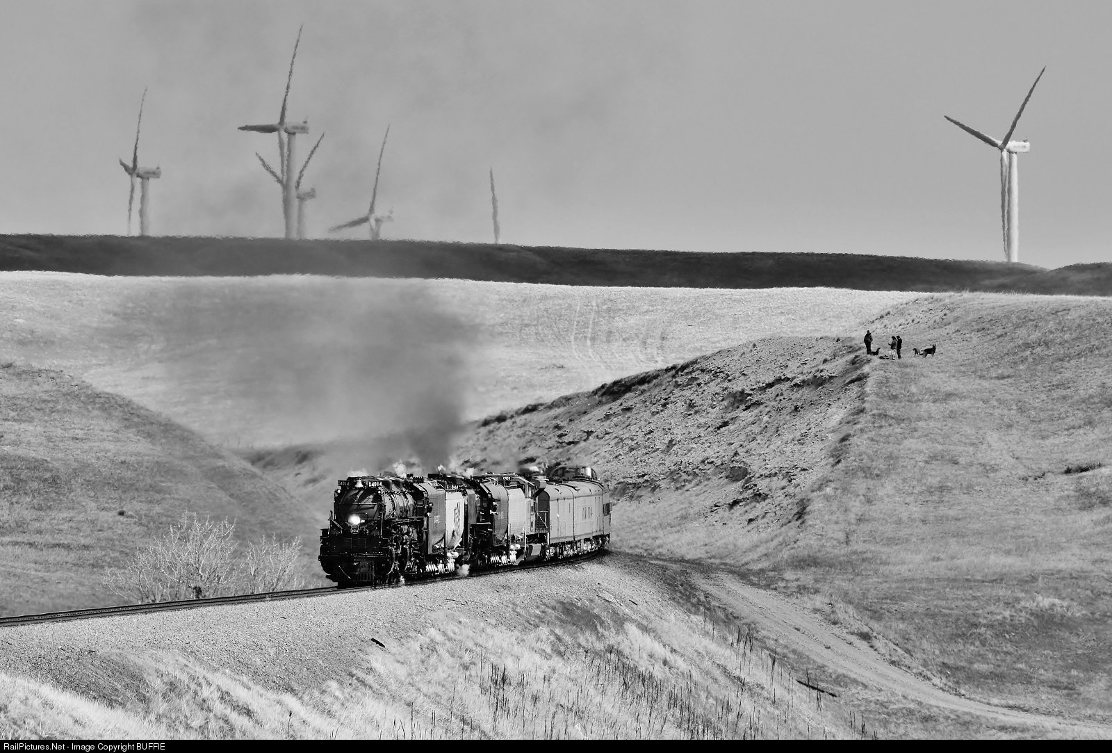 | UP Big Boy 4014 rounds the bend with a windmill farm visible in the background. The persons on the hill off to the right were flying a drone, following the engine through the open lands west of Cheyenne, Wyoming. |